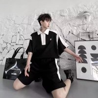 短袖套装男夏季新款港风潮流简约华夫格上衣宽松休闲五分袖体恤衫