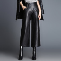 2018新款PU皮裤女韩版修身松紧高腰连体假两件加绒九分阔腿裤CYLLCY