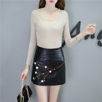 薇侣2017新品绣花黑色皮裙半身裙高腰a字短裙女秋冬包臀裙字