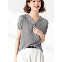 23夏季女V领针织短袖宽松短款上衣薄款百搭T恤套头打底抽条中袖