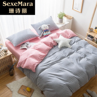 横条针织棉全棉四件套1.8m床上用品简约床单被子被套三件套床笠款 粉蓝中密 2.0m(6.6英尺)床