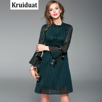 Kruidvat2017春季女装植绒条纹喇叭袖A字摆长袖连衣裙B075绿色