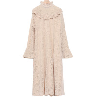 冬装新款韩版修身显瘦勾花镂空植绒蕾丝连衣裙A字裙打底裙子杏色均码