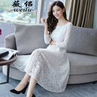 薇侣2017裙子女秋季显瘦韩版镂空蕾丝连衣裙长袖气质名媛过膝长裙白搭