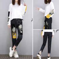 时尚圆领绣花长袖套头上衣+高腰显瘦百搭长裤套装套裙年秋季