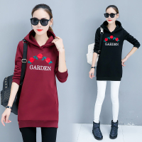 绣花修身中长款长袖套头年秋季甜美连帽卫衣绒衫口袋植物花卉时尚