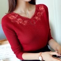 短款绣花蕾丝女打底衫秋季长袖套头毛衣女上衣显瘦针织衫毛衫女装