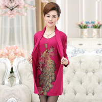 中老年女装凤凰假两件时尚妈妈装宽松刺绣绣花连衣裙针织长袖套装