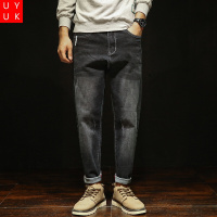 男士宽松锥形牛仔裤蓝灰渐变柔洗工艺卷边设计显瘦显高哈伦裤