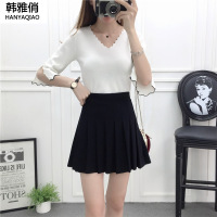 韩雅俏(HANYAQIAO)2018新品夏季短袖针织衫女高腰韩版百褶裙半身裙二件套套装裙