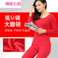 大领加绒加厚保暖内衣女U领纯棉加绒秋衣秋裤套装本命结婚大红色