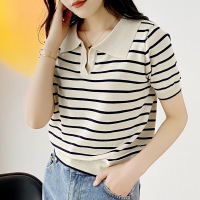2026夏季新款撞色POIO条纹休闲T恤上衣女韩版宽松V领短袖薄款
