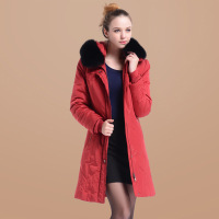 女式中老年中长尼克服大衣狐狸领獭兔毛内胆皮草女装保暖棉衣外套红色