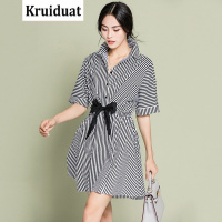 奈琴尔2017春夏新款减龄时尚黑白条纹蝴蝶结中长款印花衬衫连衣裙女YQ花色
