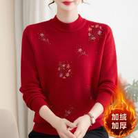 妈妈冬装加绒加厚红色毛衣新年装过年衣服中老年人女本命年打底衫
