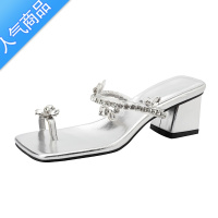 SUNTEK繁系丶凉拖鞋女夏外穿2023新款时尚夹趾粗跟高跟鞋水钻银色拖鞋