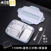 三维工匠饭盒便当男餐盘小学生高中学生儿童分多格分隔型不锈钢防烫午餐盒 3格北欧灰蓝1000+筷子勺子+保温袋
