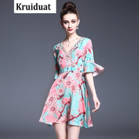 YIBUSHENG蝴蝶印花小飞袖雪纺连衣裙女季修身绑带度假绝美收腰包臀长裙子