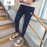 @港仔文艺男秋装新款卡通潮牛仔裤青少年男士刺绣笑脸修身小脚裤