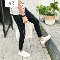 港风男士秋季新款字母刺绣九分牛仔裤修身显瘦百搭潮流弹力小脚裤
