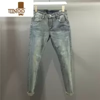 YANXU2023新款复古做旧水洗牛仔裤男士弹力修身浅蓝九分小脚裤子韩版潮