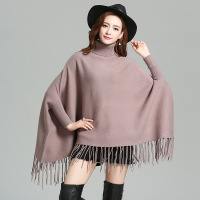 薇侣2017新品高领毛衣女中长款春装套头斗篷披肩蝙蝠衫秋冬外套女装流苏针织衫