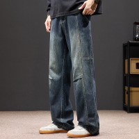 垂坠感阔腿工装牛仔裤男 做旧蓝黑水洗 侧袋明线 美式复古直筒裤