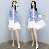 顺崇2018春季新款女收腰显瘦蓝白条纹拼接不规则连衣裙衬衫裙