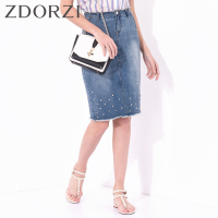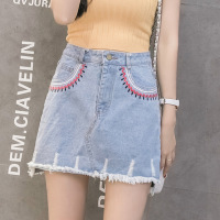 薇侣2017新品夏季女装牛仔裙半身裙高腰绣花后长毛边A字短裙子