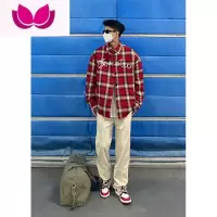 七斓美式复古刺绣红色格子休闲衬衫男hiphop长袖宽松衬衣外套潮