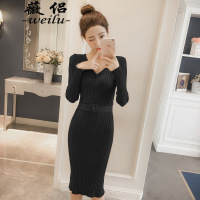 港味韩版黑白撞色条纹连衣裙女秋冬新款修身显瘦气质温柔针织长裙_752