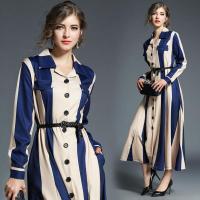 欧洲站气质长裙2017秋冬女装新款收腰显瘦条纹大摆连衣裙蓝色