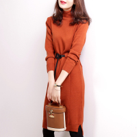 秋冬新款半立领长袖针织连衣裙侧边系带收腰显瘦小高领中长裙子潮