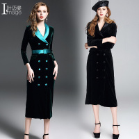 欧洲站名媛 新款秋冬丝绒连衣裙系带收腰双排扣显瘦开叉长裙