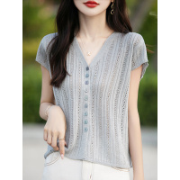 韩版2026夏季新款显瘦镂空坑条针织短袖V领小飞袖系扣小衫女