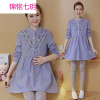 锦铭七玥孕妇装时尚竖纹长袖孕妇上衣春秋装新品中长立领孕妇衬衫