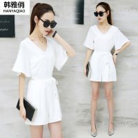 韩雅俏(HANYAQIAO)2018新品新款夏装修身短裤腰带阔腿裤休闲裤显瘦V领高腰飞袖连体裤