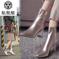 秋冬金属牛皮靴子女靴水晶鞋尖头粗跟高跟短靴裸靴银色婚鞋