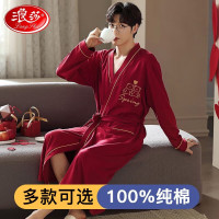 浪莎睡衣男士睡袍纯棉秋冬季浴衣中长款家居服宽松大码可外穿睡袍 本命年红色 L/170