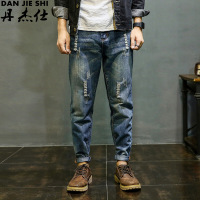 丹杰仕2016冬季哈伦裤男韩版小脚裤加绒牛仔裤日系破洞复古长裤子宽松大码潮
