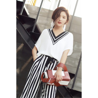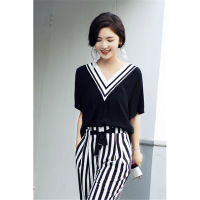 春秋套装套裙V领短袖时尚气质韩版百搭条纹潮流T恤+九分裤