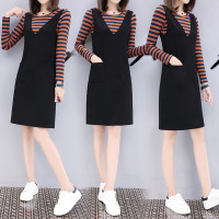 顺崇2018春季新款胖MM两件套背带裙女套装时尚连衣裙条纹T恤套裙
