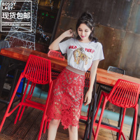 2017夏欧美老虎印花白T恤女蕾丝半身裙时尚潮套装裙