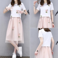 待君归 夏季套装裙女2018新款女装韩版时尚T恤网纱裙两件套学生连衣裙 潮