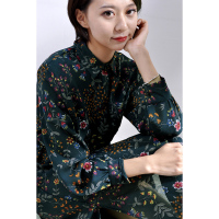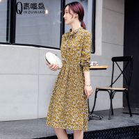 名媛风衬衫式碎花连衣裙 气质翻领长袖印花裙 系带显瘦中长开衫裙