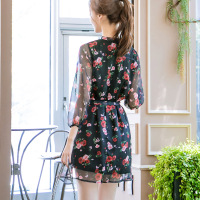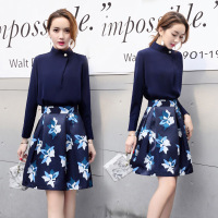莞馨2017秋季新品圆领长袖雪纺衫碎花短裙两件套 连衣裙 女 潮