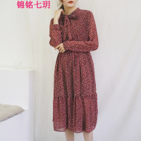 尊首新款20172017年春装新款中长款显瘦修身长袖碎花连衣裙蝴蝶结领打底裙女