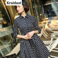 Kruidvat2017春夏季新款女装卡通印花蝴蝶结系带修身显瘦大摆裙LT深蓝米奇图翻领七