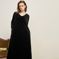 工厂出清 维多利亚优雅色复古丝绒V领长袖系带气质连衣裙长裙