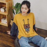 毛衣春秋2017新款套头女bf风卡通贴步宽松袖口破洞撞色拼接上衣